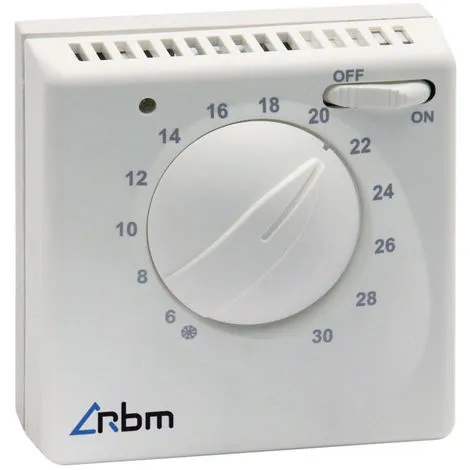 Thermostat d’ambiance électromécanique avec lampe témoinFixation muraleBlancInterrupteur On-offPlage de réglage 5 – 30°CDifférentiel 0.4 – 0.8KProtection électrique IP20Contact en commutation 16(2.5)A/250 V
